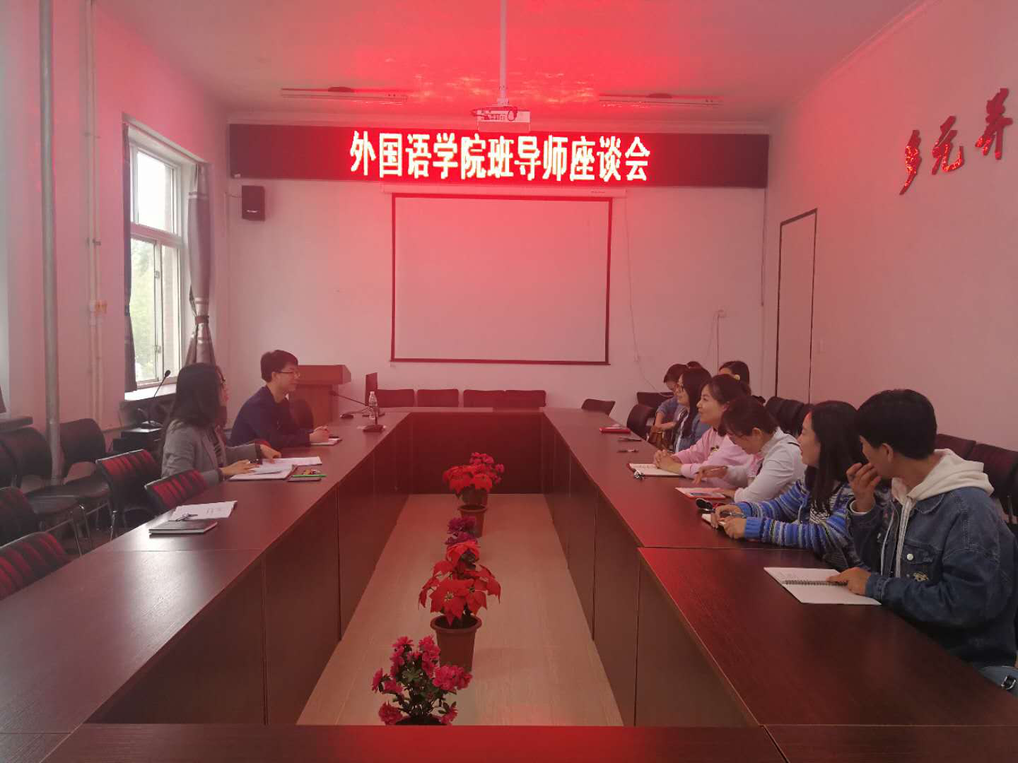 于5月10日下午在知行楼二楼会议室召开班导师座谈会,学院党委副书记张亚男、全体辅导员、班导师出席本次座谈会。