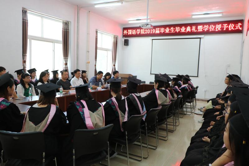 孙宝成书记代表学院党政班子及全体教职工向完成学业的2019届本科生表示热烈的祝贺,并以“做一个终身学习、勇于担当的人”为题向全体毕业生致辞,希望同学们在互联网+时代,走上工作岗位后要紧跟时代步伐和潮流,要“活到老、学到老”。秉承“朴实无华、坚韧顽强、无私奉献”的太阳石精神,把严谨求实的作风带到自己的工作岗位上,扎实工作,积极进取,传承外语学子的使命与担当,攻克难关,攀上新的高峰。