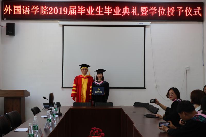 2019届毕业生毕业典礼暨学位授予仪式在学院学术交流室隆重举行。院长徐平、党委书记孙宝成、副书记张亚男、副院长冯雪、副院长李培培、部分教师、全体毕业生共同参加了本次典礼。典礼由学院团委书记周扬主持。