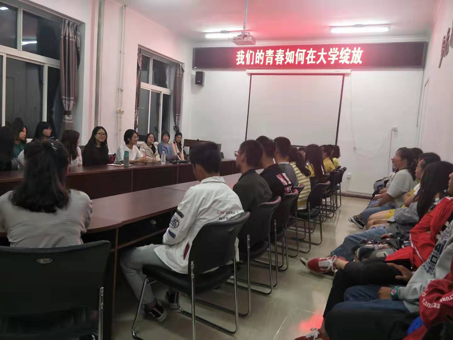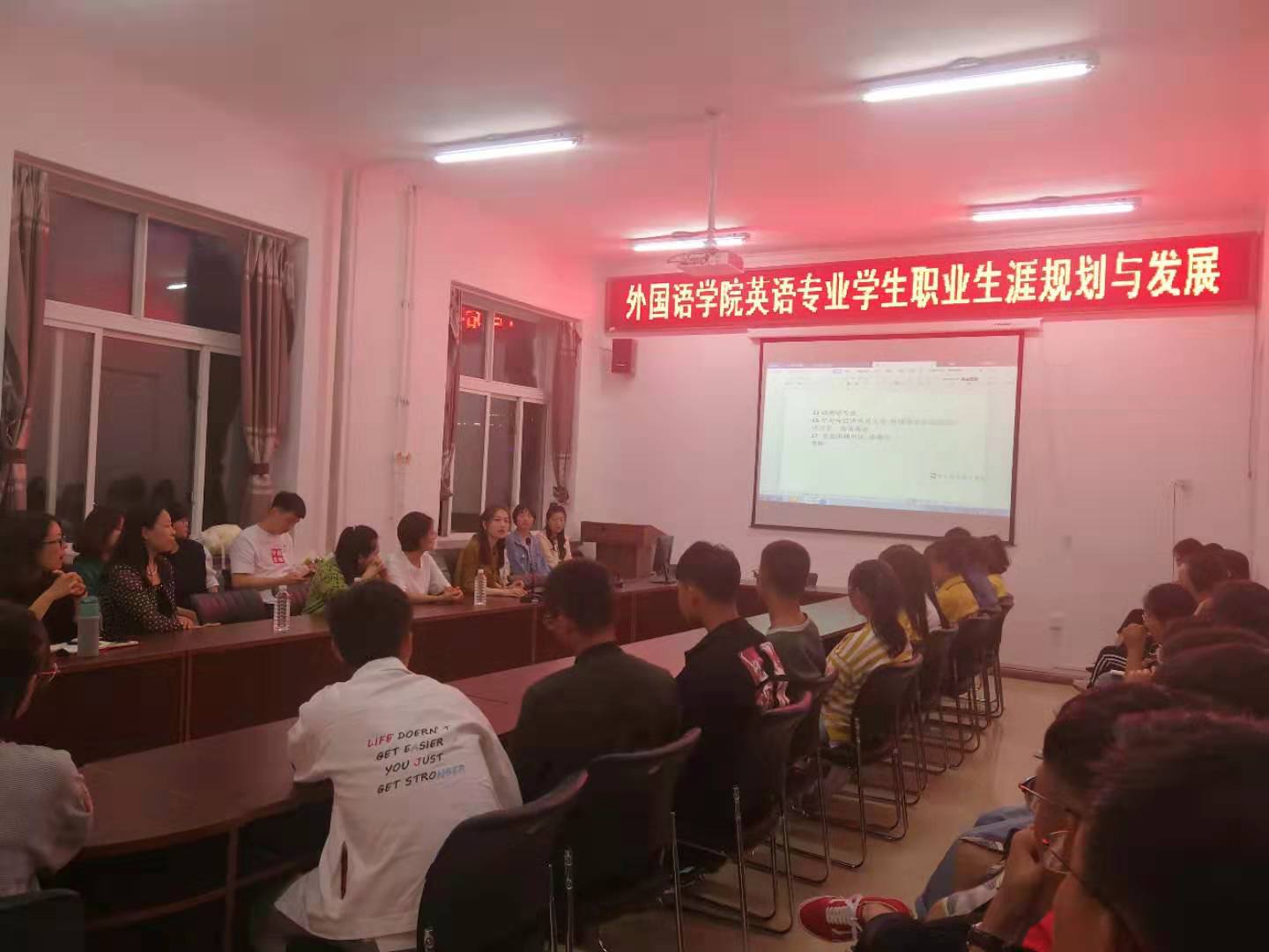 邀请2015届毕业生李沫和2018届毕业生任潘婷于9月14日晚7点在知行楼会议室为新生做学业和就业规划指导。学院院长李玲、党委副书记张亚男、英语系主任田华,学院辅导员黄秋雨和全体新生参加本次讲座。