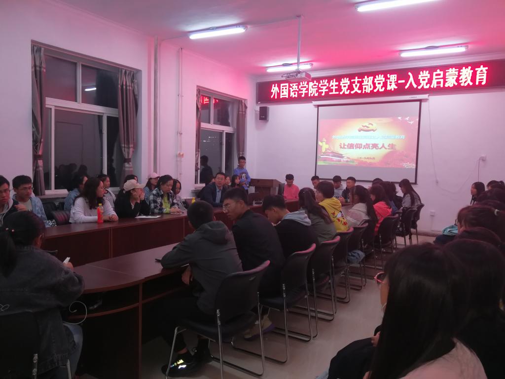 在知行楼202举行2019级新生入党启蒙教育,学院党委书记孙宝成担任主讲人,辅导员黄秋雨和2019级全体新生参加。