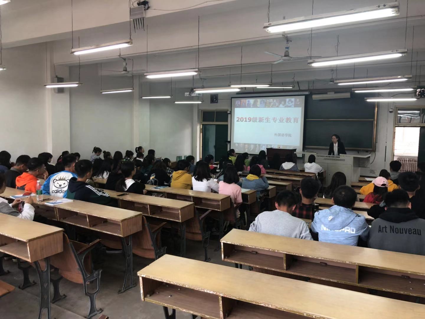 2019年9月19日下午16时,外语学院在新华楼305开展2019新生专业适应性教育,外语学院党政领导、2019级辅导员和班导师参加了本次活动,由李培培副院长主讲。