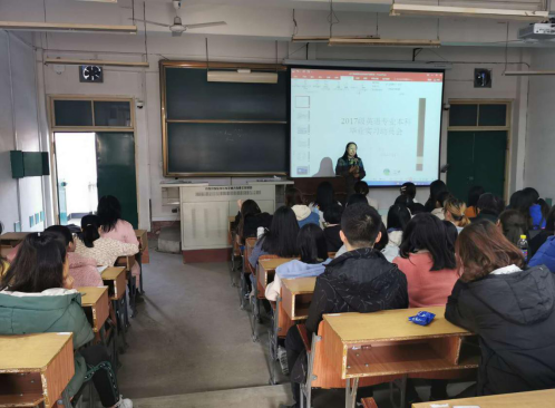 李院长首先详细讲解了毕业实习目标、实习主要任务和实习要求。毕业实习是本科重要的学习环节。毕业实习能使学生综合运用在课堂教学中所学到的知识和技能,全面提高听、说、读、写、译等方面的语言运用能力,促进人才培养目标中毕业生在经贸、商务、外事、文化、教育等部门熟练运用英语从事经贸、商务、外事、翻译、管理、教育等各种工作,培养学生理论联系实际的能力,增强英语专业学生的就业竞争能力。
