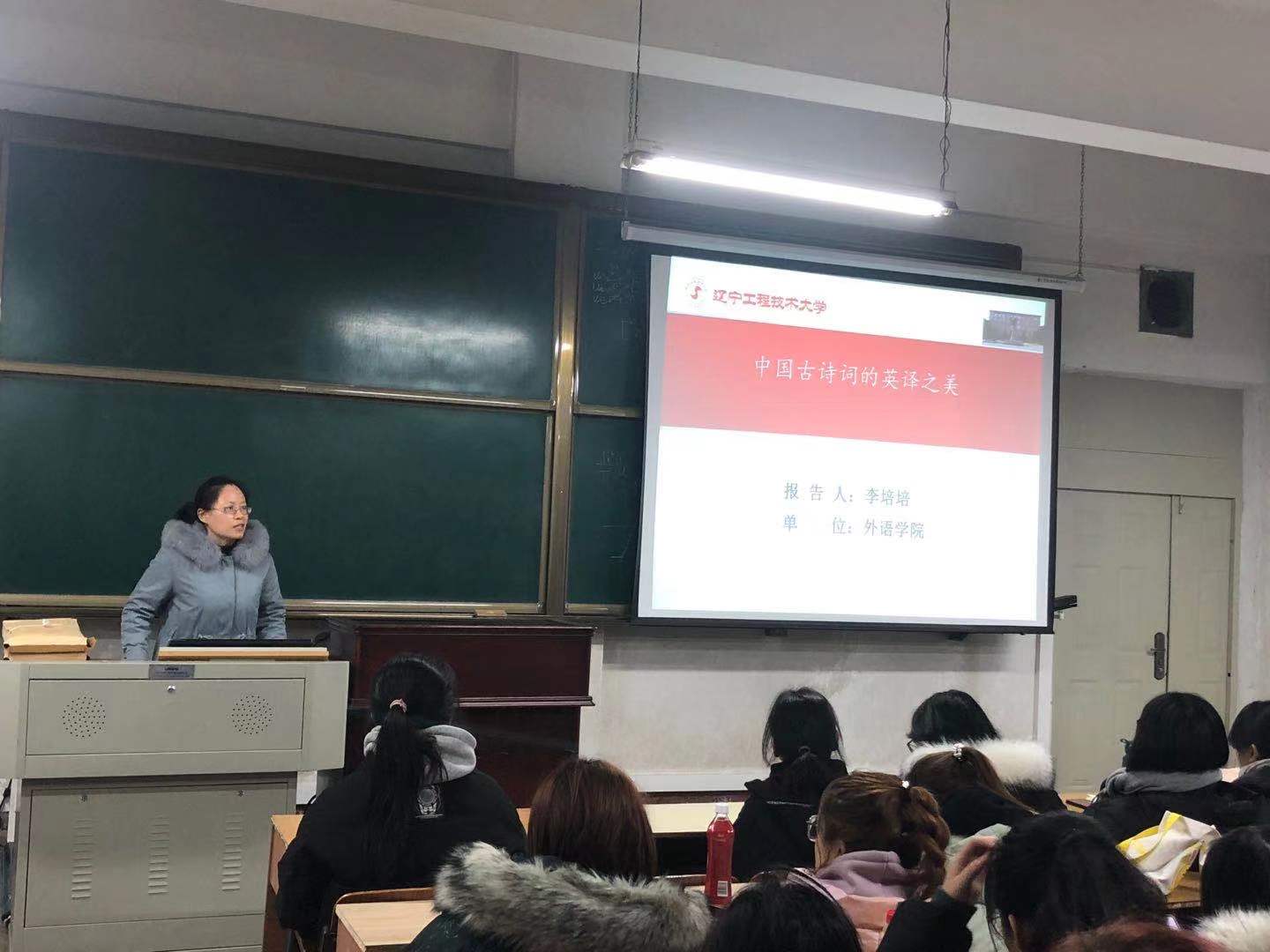于2020年12月6日在新华楼开展科研训练---《中国古诗词的英译之美》讲座,本次讲座由学院副院长李培培老师主讲,学院各年级学生参加。