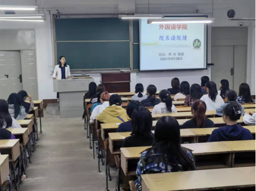 进行了全面介绍,使同学们对学院的专业设置、师资力量、学生活动有了比较全面的了解。同时,在讲解的过程中,李玲还结合当下疫情防控的社会现实,激励同学们不忘初心、砥砺奋进,发挥好外语专业优势,努力在国际舞台上传递好中国声音。李玲向2021级全体新生送上了诚挚的祝福,勉励大家大家要不负青春、不负诗和远方,与外院共成长。