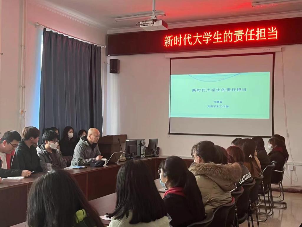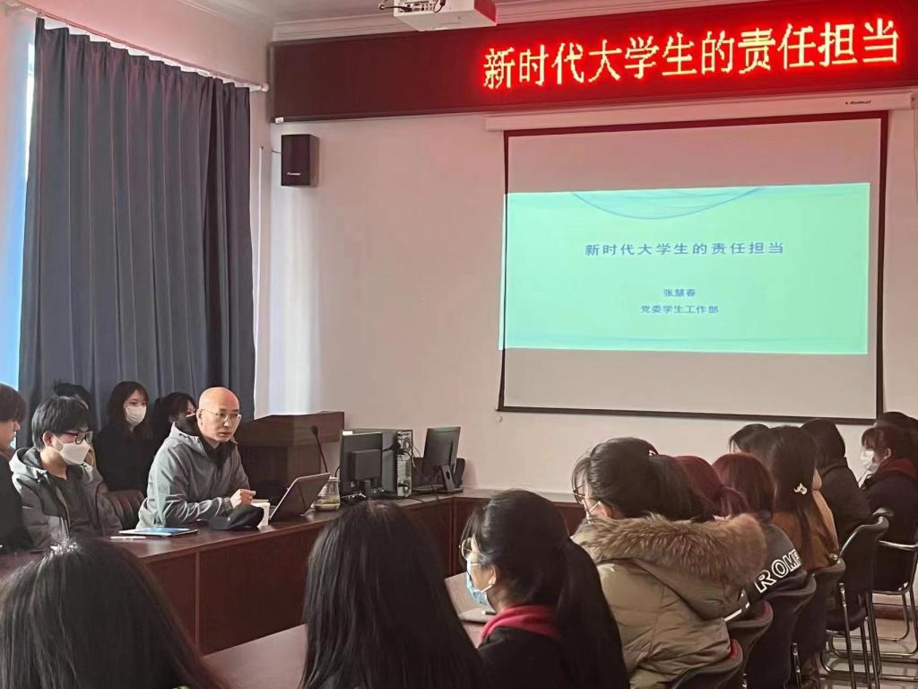 学生处处长张慧春教授主讲,由学院党委副书记张亚男主持,团委书记黄秋雨、学工部主任杨雯雯、部分班导师及学生代表参加。