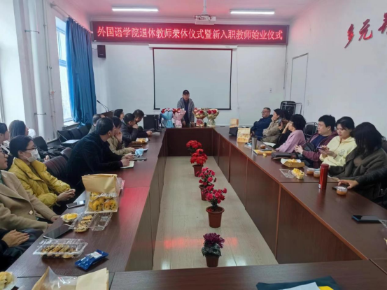 在知行楼二楼会议室举行退休教师荣休仪式暨新入职教师始业仪式,学院工会主席冷德军主持仪式。
