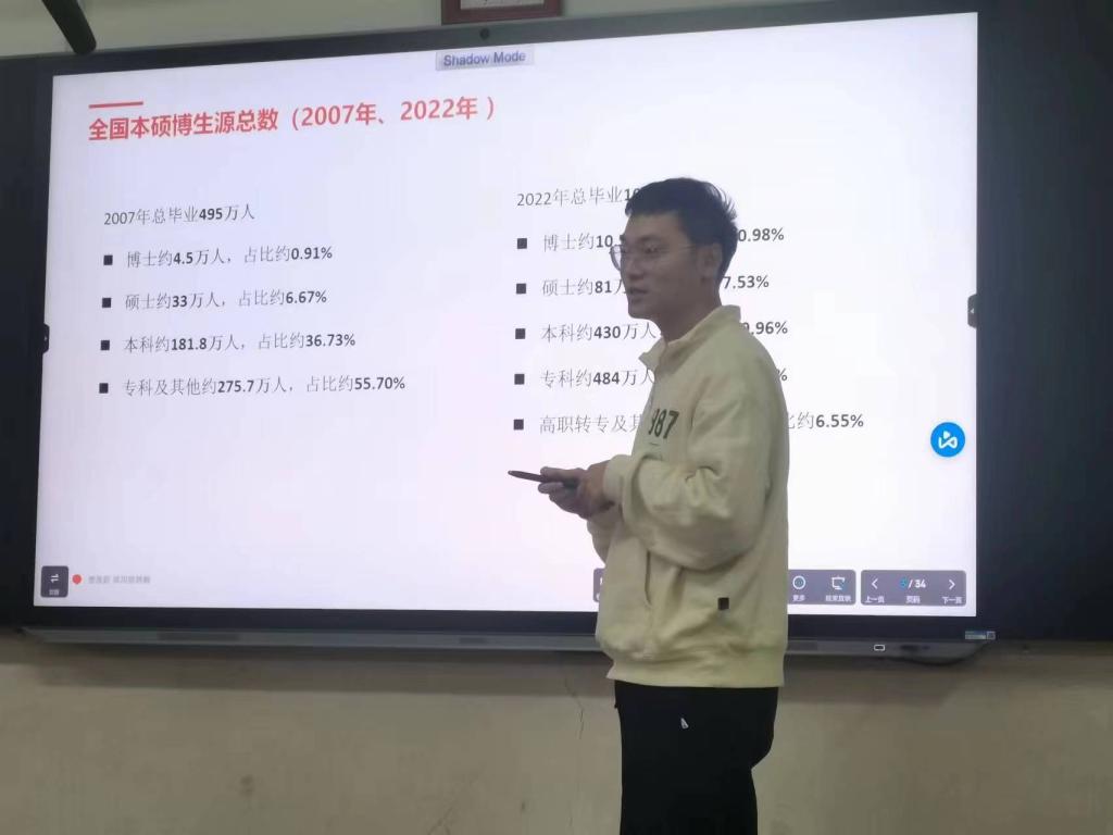 为学习贯彻党的二十大精神,抓好就业这个最大的民生,做实做细2024届毕业生就业服务工作,引导毕业生积极就业,我院于2023年5月8日在博雅楼211开展了“就业经验分享会”,邀请校就业服务中心主任任思行老师及2023届优秀毕业生代宝林做就业指导、分享。会议由张亚男副书记主持,全体2024届毕业生参加。