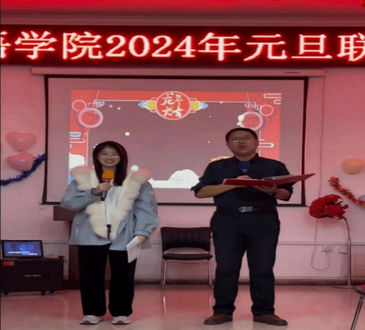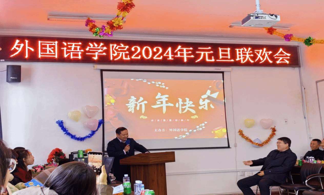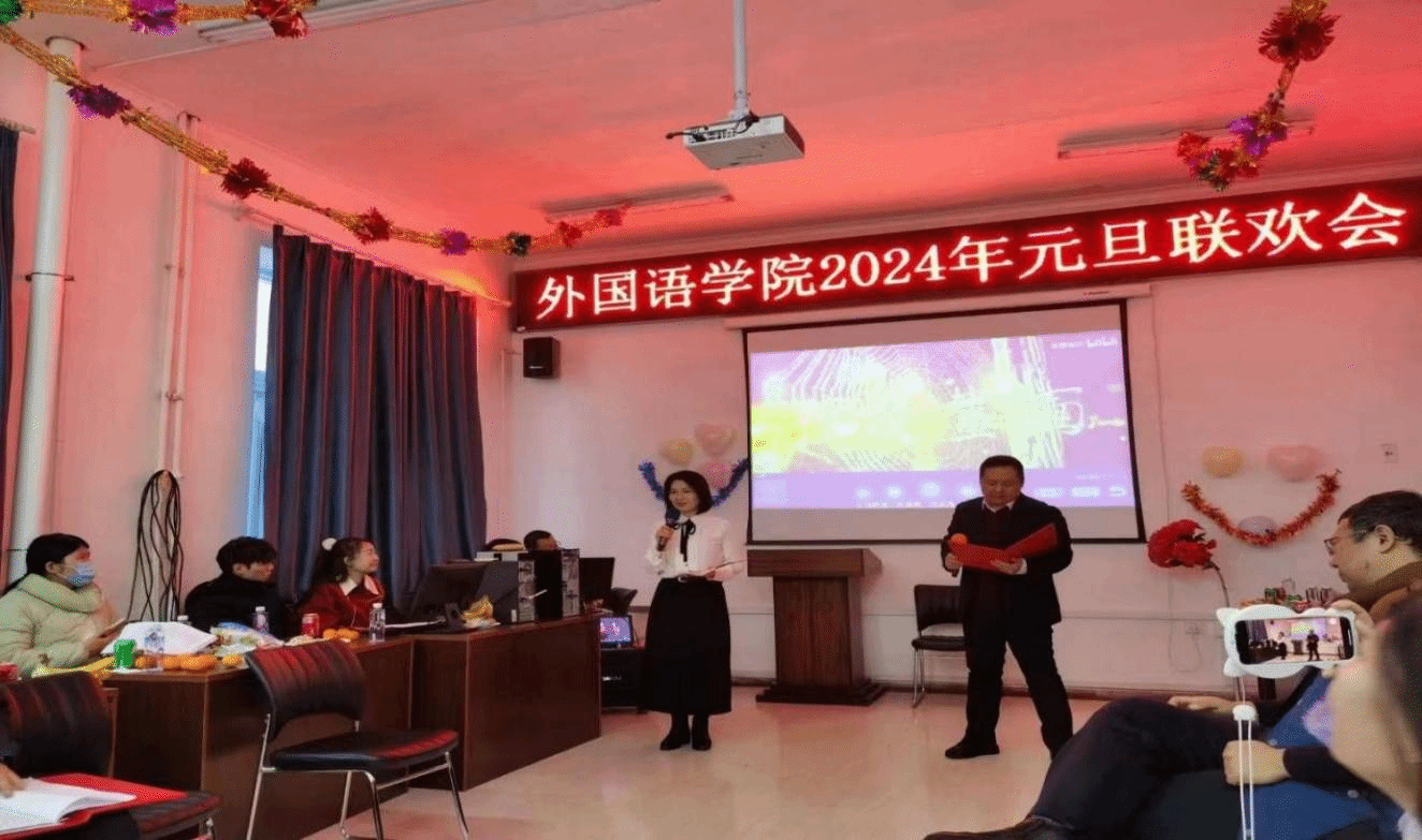 教职工欢聚一堂,举行2024年元旦联欢会。联欢会由诙谐幽默的工会主席冷德军老师和青春活泼的学生工作部主任杨雯雯老师共同主持