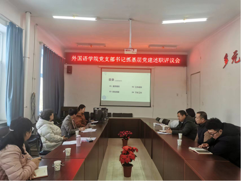 大学英语第一教学部党支部、大学英语第二教学部党支部、英语系党支部、机关党支部以及学生党支部书记就思想政治教育、组织建设、党风廉政建设、党员先锋模范作用等方面依次进行了述职,详细介绍了本支部过去一年的工作情况,针对工作中遇到的问题和困难进行了深刻剖析,并提出了改进措施。