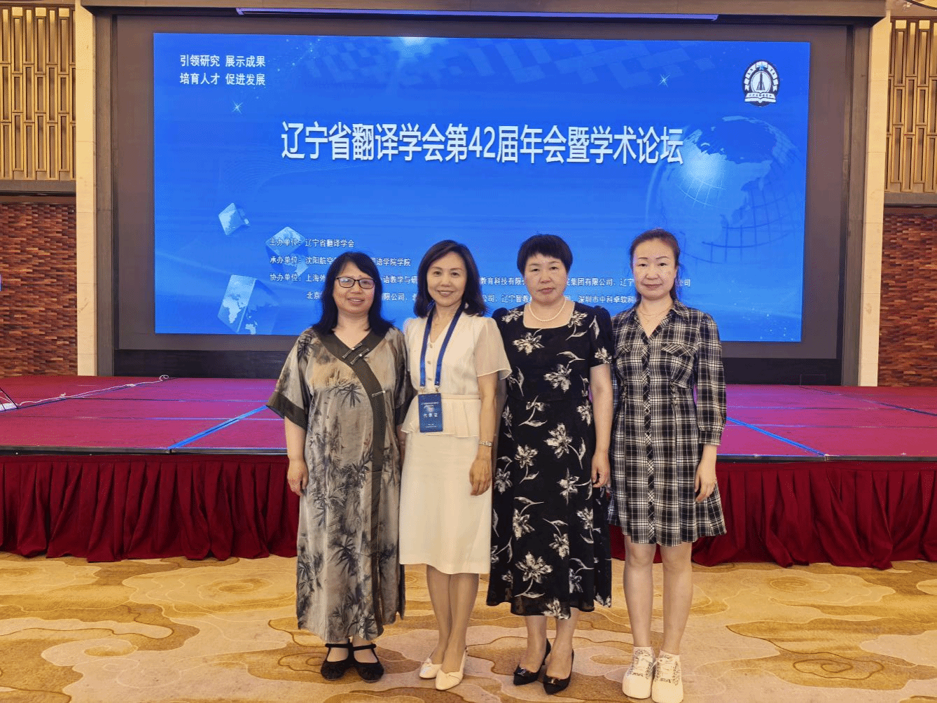 院长王丽教授、大学英语第一教学部主任、党支部书记于兰,大学英语第二教学部主任赵紫薇,英语系教师田华一行4人参加本次年会。