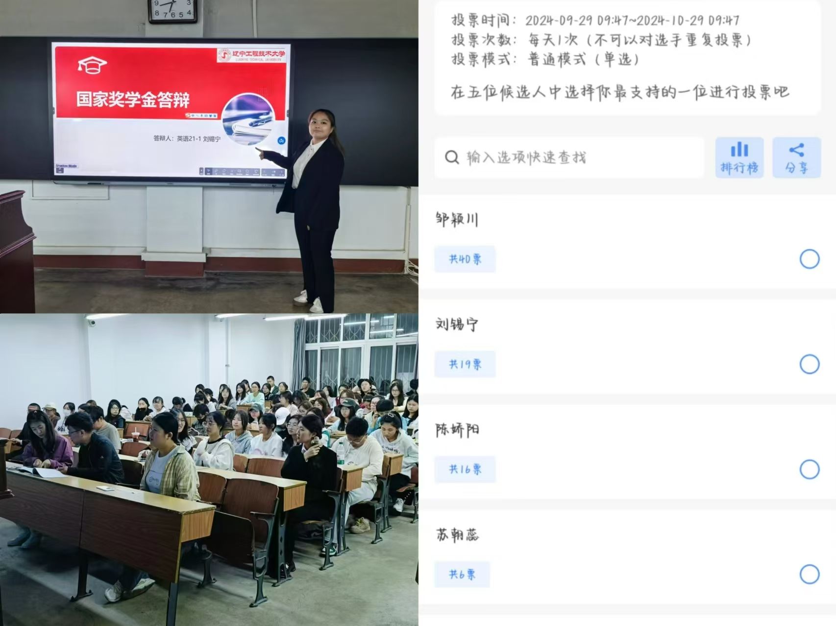 答辩会分为个人陈述、评委打分、新生投票三个环节。参与答辩的同学从学术获奖情况、志愿活动、社会实践等几个方面展示了自己的学习成果和综合素质。五位答辩同学不仅在学业上追求卓越,更用实际行动诠释了新时代大学生的使命与担当。在评审过程中,各位老师严格遵循国家、省政府奖学金的评审标准,以严谨认真的态度审阅每位学生的答辩材料,全面了解学生的综合素质,从而对每位候选人的答辩进行了公正评分。