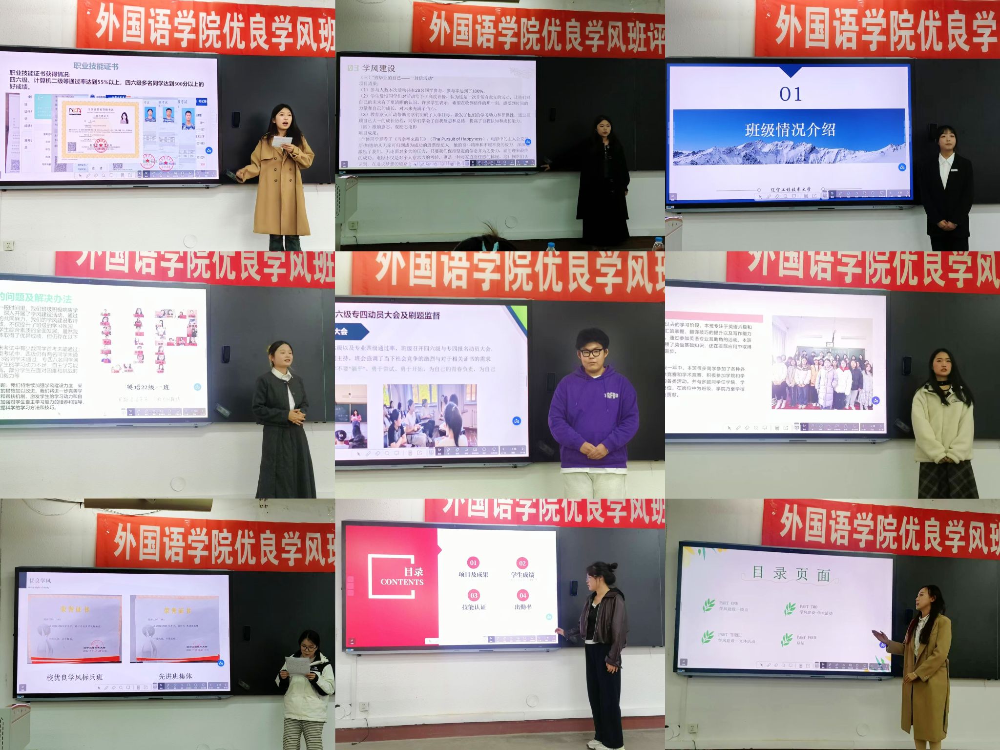 此次活动得到了学院领导的高度重视,学院院长王丽、党委副书记杨洋、学院党委委员于兰和李爽、校教学督导陈鸿雁、学院教师代表巩艳博担任了活动的评委,宋红雪、杨雯雯、黄秋雨等班导师和学院全体学生共同参加。英语21级、22级和23级9个班参加了评选,各班长从多个方面进行了汇报,包括班级平均学分绩、加权平均分、期末考试优良率、专业技能、学风建设项目情况、学术竞赛获奖情况以及文体活动获奖情况等,充分的展示了各班级学风建设的成果与做法。