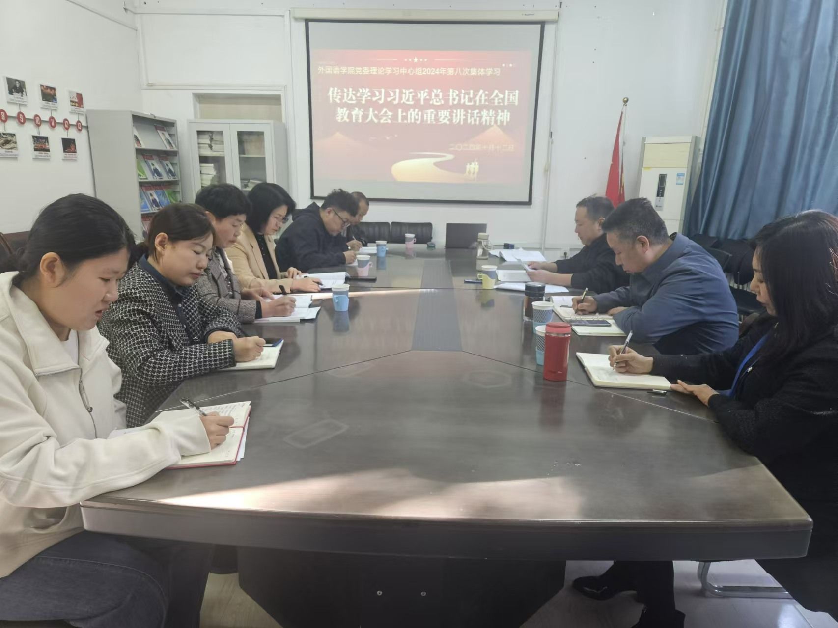 会上,学院党委书记苏海泉同志传达习近平总书记在全国教育大会上的重要讲话精神;党委常委、统战部(党委教师工作部)部长汪玉柱,学院副院长冯雪,党政办公室主任李爽,大学英语第一教学部主任于兰就学习内容分别作中心发言。