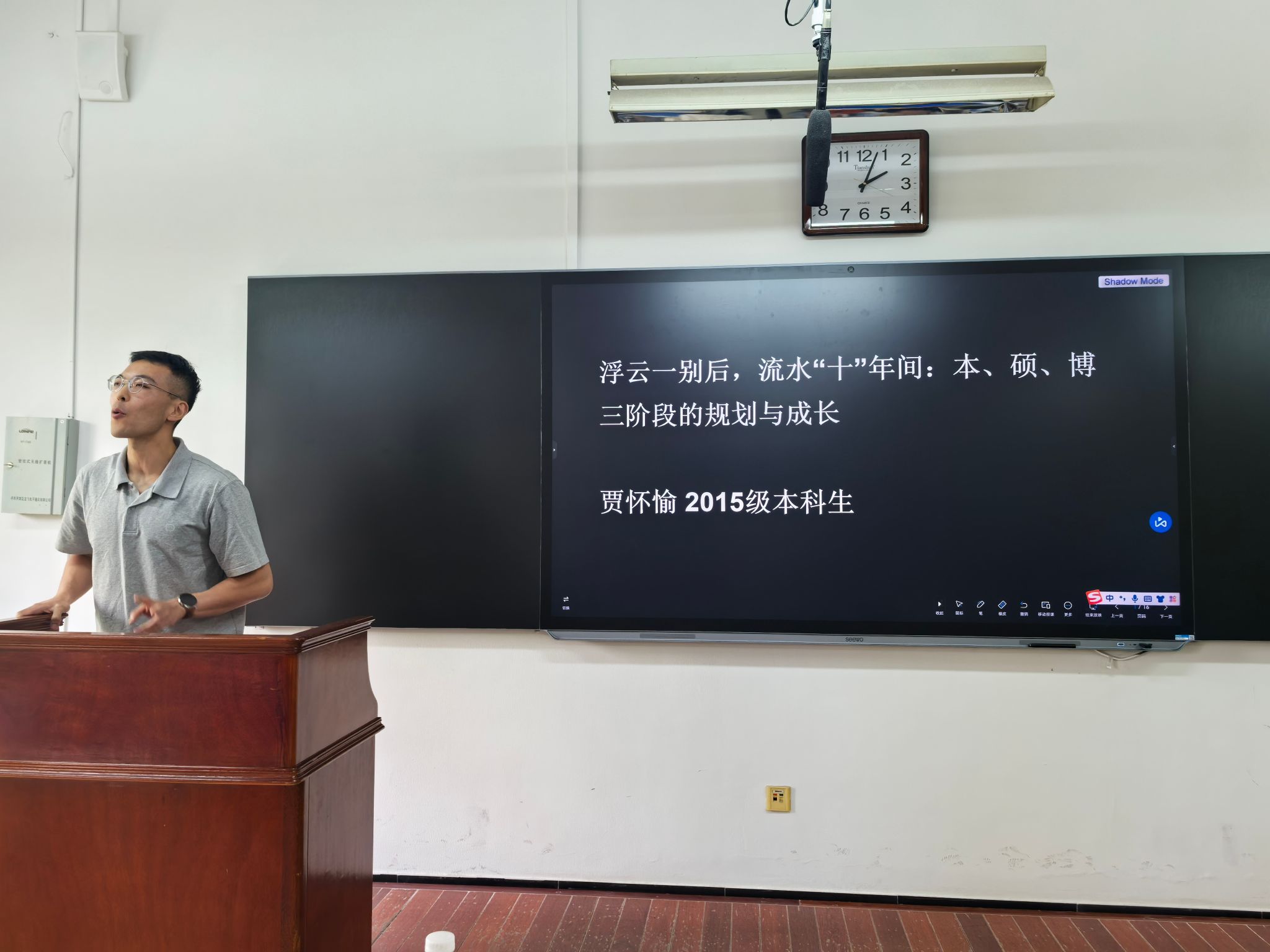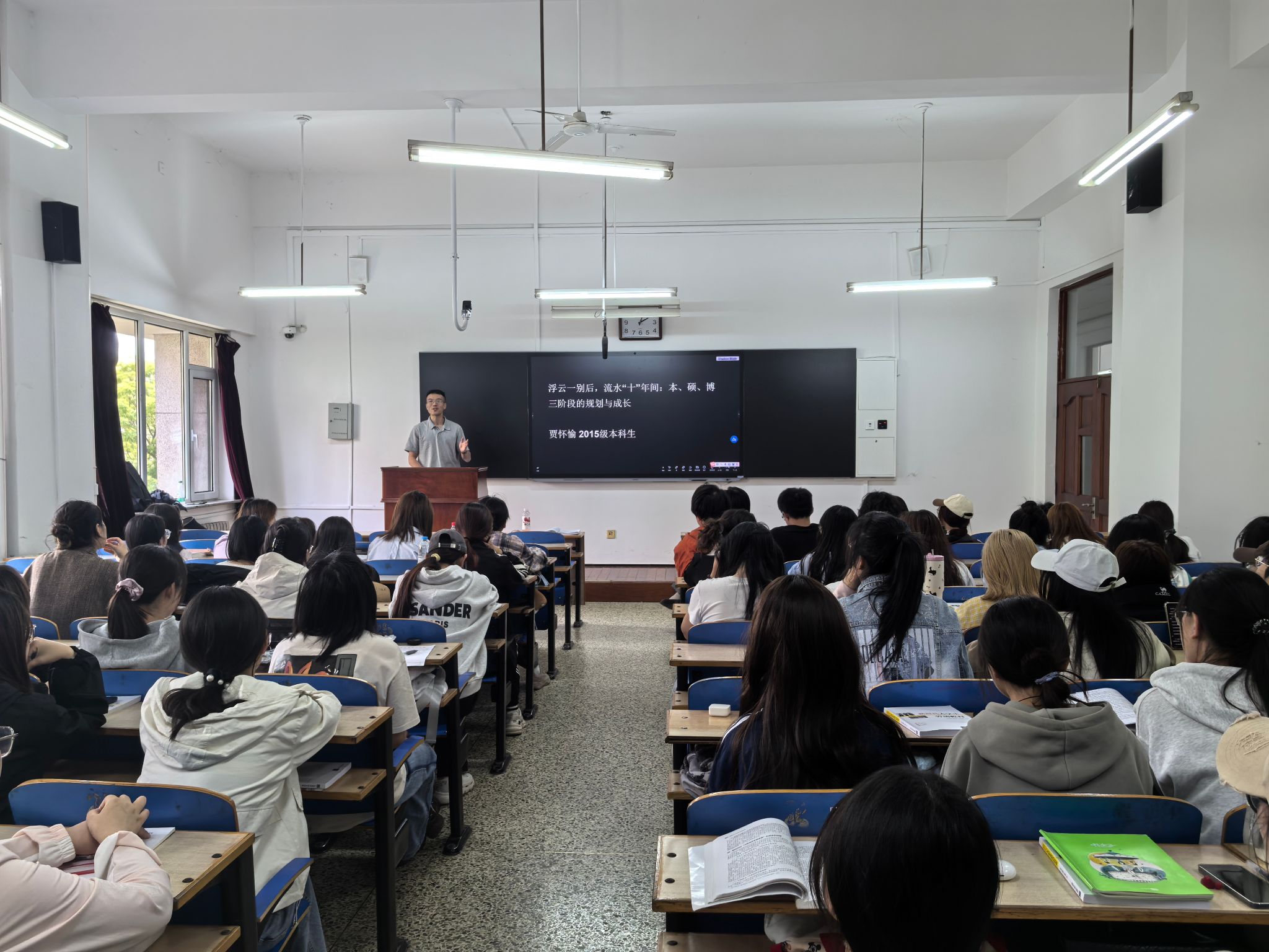 学生锚定学业发展方向、激发专业学习内生动力,2025年5月22日,学院于博雅楼213开展了以“浮云一别后,流水‘十’年间”为主题的“优秀校友进班级”活动。本次活动特邀英语专业2019届优秀毕业生、广东外语外贸大学博士贾怀愉担任主讲人,面向2022至2024级在校学生展开经验分享。