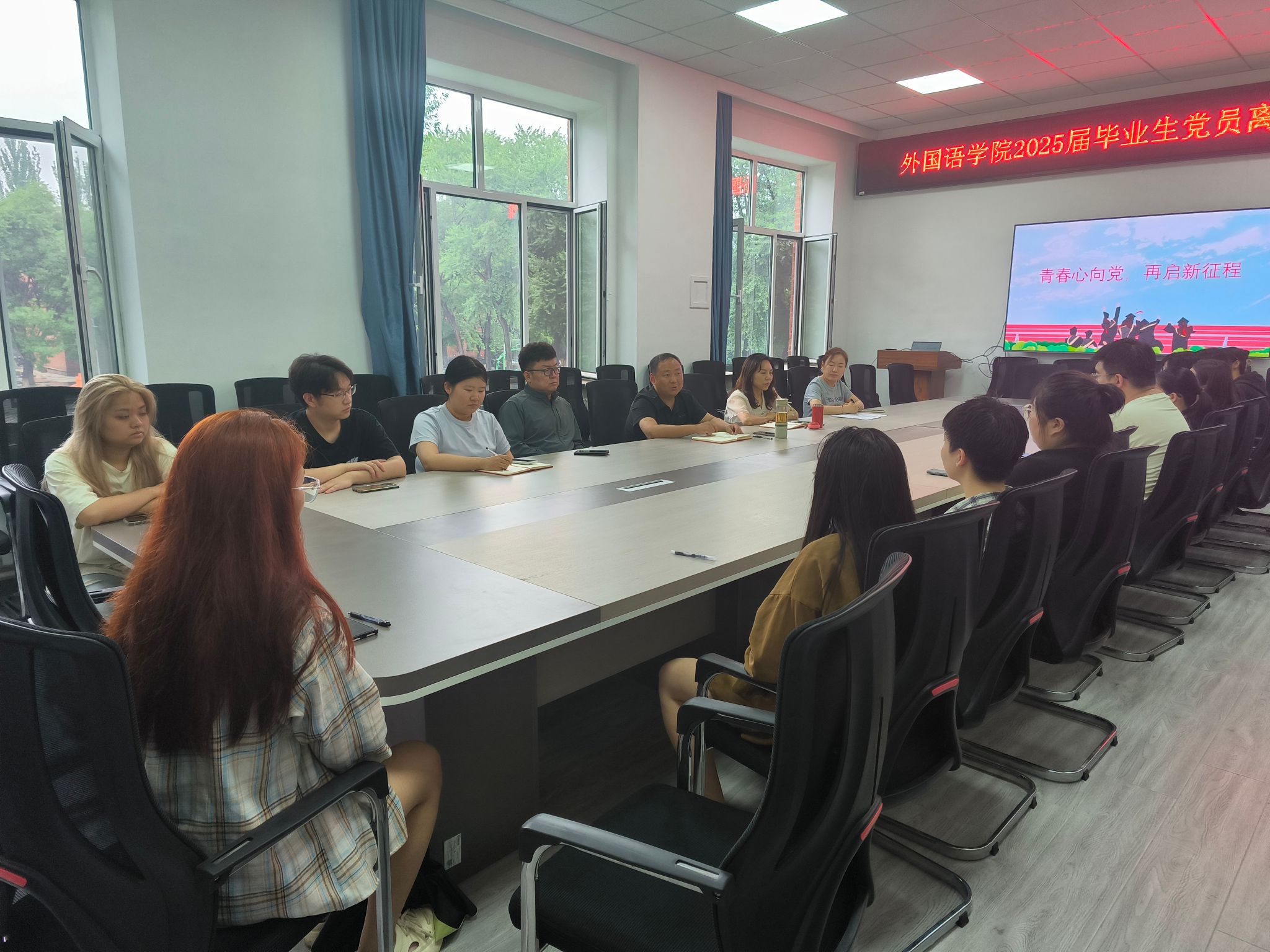 2025届毕业生党员 “最后一课”在知行楼202教室温情开讲。学院党委书记苏海泉,院长王丽,党委副书记杨洋,团委书记、学生党支部书记黄秋雨与全体毕业生党员齐聚一堂,共同聆听这场兼具思想深度与情感温度的“最后一课”,活动由组织员宋红雪主持。