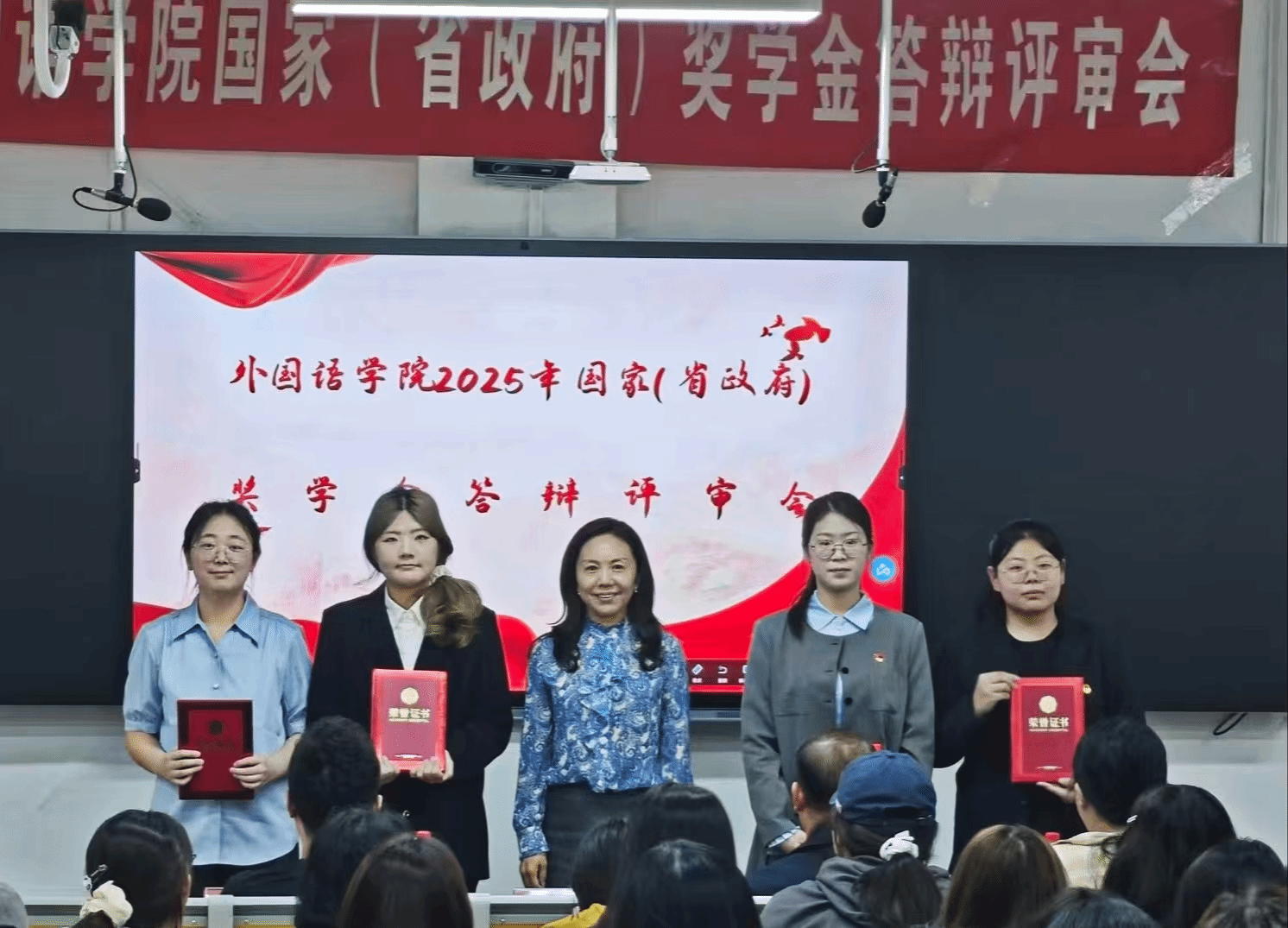 本次答辩会严格遵循校党委学生工作部要求“公平、公正、公开”的原则,由学院领导和教师代表组成评审团,从智育成绩、综合发展素质、现场答辩等多个方面对候选人进行综合考评。答辩分为个人陈述,评委打分,新生投票三个环节。每位答辩学生依次迈上讲台,她们用流畅的语言表达、严谨的逻辑思维、扎实的专业功底,层层深入来展示个人的优秀能力。经过激烈的答辩,最终英语22-2班苏朝蕊、英语22-3班陈娇阳获国家奖学金,英语22-1班孙鑫荣、英语23-2班王硕获省政府奖学金。